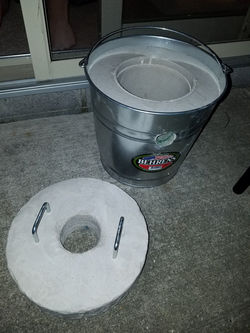 ![]() The first forge. 12 qt bucket lined with a sand plaster mix and powered by a hair dryer. |